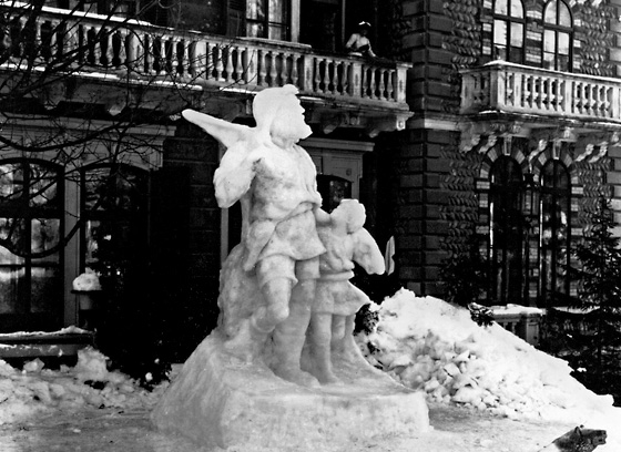 Vor dem Grand Hotel Bear: Eisskulptur von Jakob Abplanalp, einem Schnitzler mit Weltruf. Er wurde an der Weltausstellung 1905 mit einer Goldmedaille ausgezeichnet. Nebenbei organisierte er als erster einwöchige Skikurse mit Norwegern als Instruktoren.