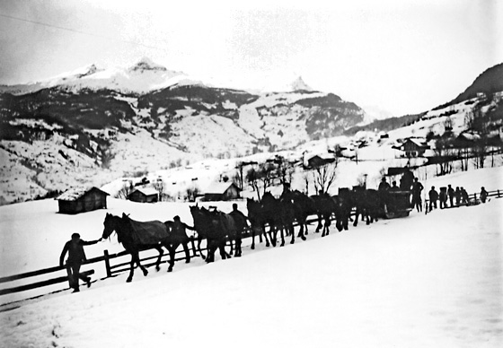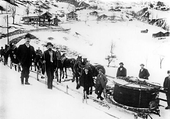 Mit einem Zwölfspänner am 20. Dezember 1905 unterwegs zur Talstation des Wetterhornaufzuges, mit dem Kabel für die erste Luftseilbahn der Schweiz. Ein paar Wochen vorher war der deutsche Ingenieur Feldmann, der Begründer der Bahn, gestorben. Die Arbeiten gingen aber wie geplant weiter.